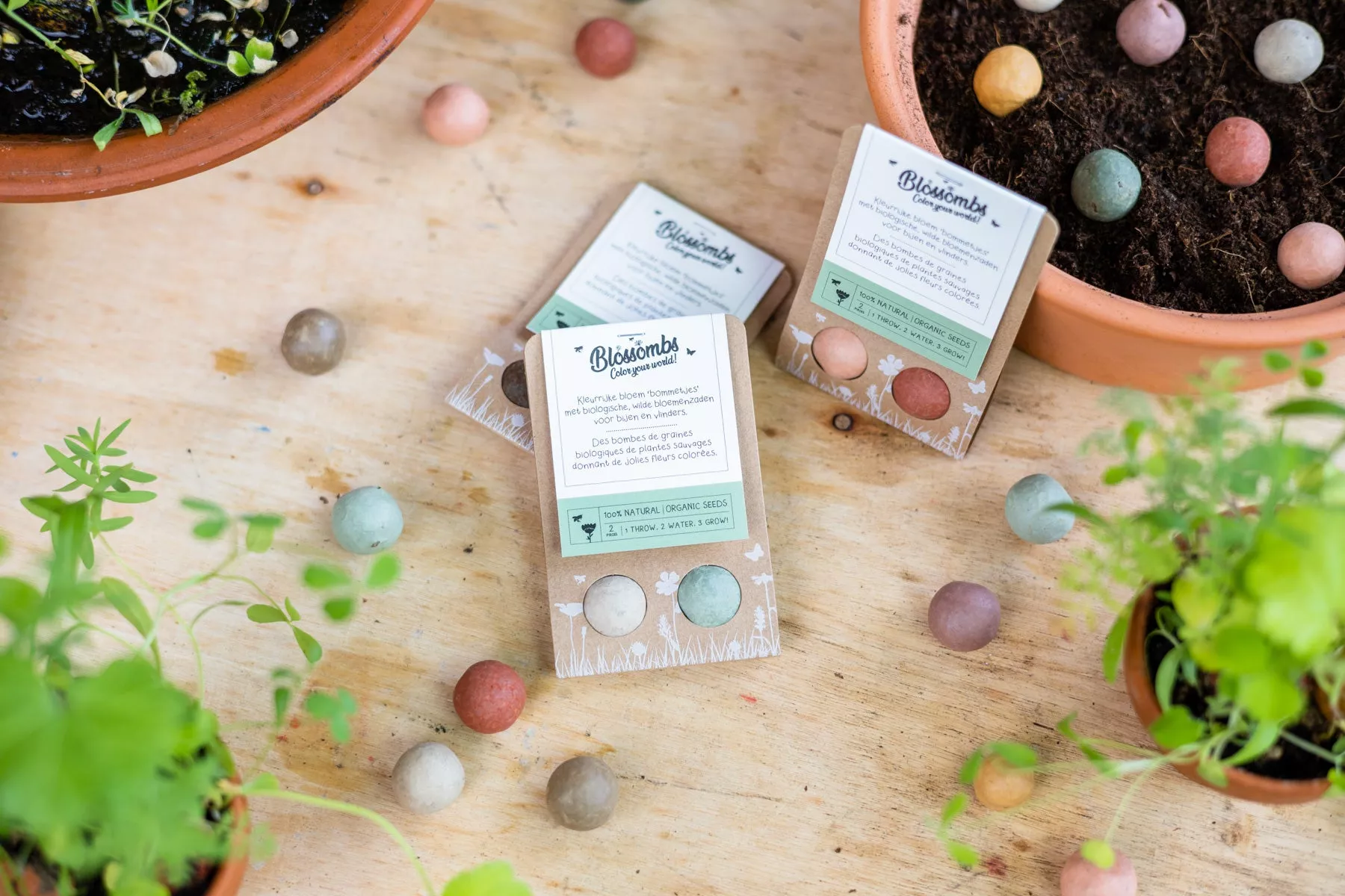Ebben a kis készletben a holland Blossombs 2 agyaggolyót rejtett el BIO vadvirágok magjaival, mint például pipacs, búzavirág vagy lóhere.