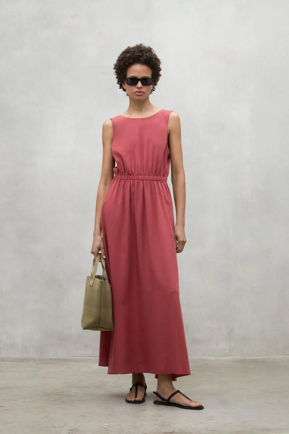 A ruha szabályos szabású és elegáns, kerek nyakkivágással rendelkezik, ami időtlen megjelenést kölcsönöz neki. A deréknál lévő fodrok kiemelik a sziluettet, míg a rugalmas pánttal ellátott nyitott hátrész kifinomult elemet kölcsönöz a ruhának. Az oldalsó bevarrt zsebekkel a praktikumot az eleganciával ötvözi.