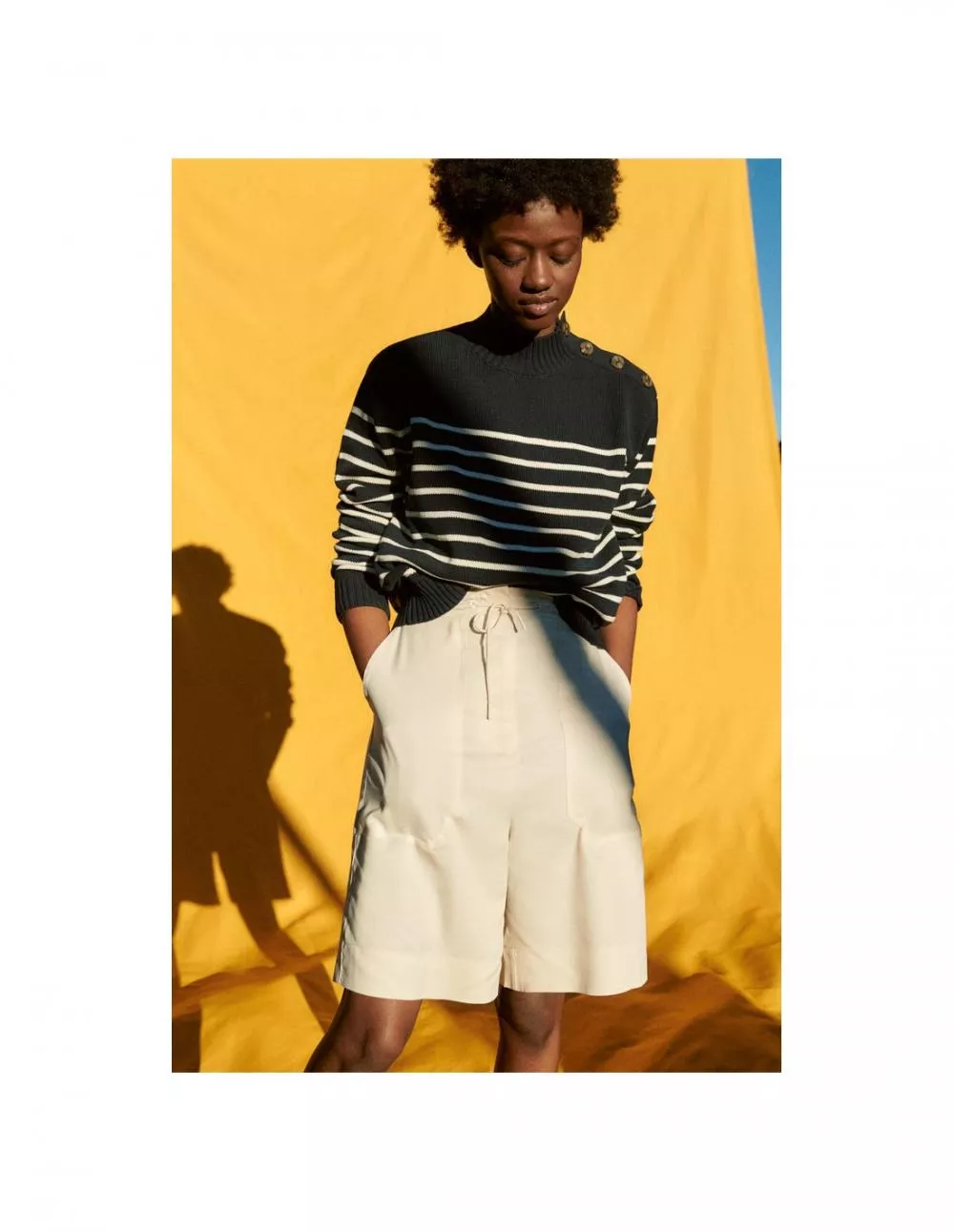 Egy csíkos, tengerészkék pulóver, amely kétségkívül sok nő ruhatárába belefér. Organikus pamutból készült. Ettől puha és bújós, és remekül viselhető lesz. Eredeti jellegzetessége a vállán található nagyméretű gombok.