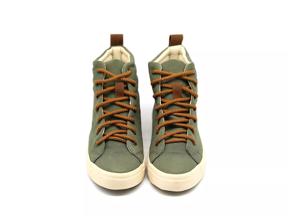 Kényelmes khaki színű magas szárú Musgo Classicos Perky párnázott bokapárnázással a boka felett női és férfi méretben. Az anyag hulladékból és újrahasznosított PET-palackokból készült, így ezek a tornacipők a környezetbarát kollekcióba tartoznak, és a felhasznált szintetikus anyagok miatt a tornacipők vegánok.