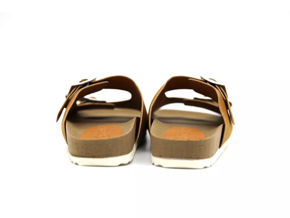 Nyitott csatos papucs, amit elsőre meg fogsz szeretni. A könnyedséget és a kényelmet az anatómiai talpbetét biztosítja, amely expandált PVC-ből készült, a talp pedig ütéscsillapító EVA ellenálló hab. A felsőrész karamellbarna műbőrből készült. A felhasznált szintetikus anyagoknak köszönhetően a papucs vegán.