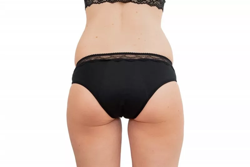 "Fekete kisméretű" menstruációs bugyi nem hiányozhat egy elegáns, fenntartható hősnő ruhatárából. A klasszikus, alacsony derekú szabás kényelmet nyújt, és a derékrészen lévő romantikus csipkével elegánsan érezheted magad még azokon a napokon is.